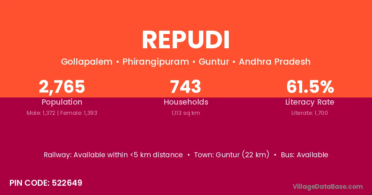 Tiruvuru (23 km) is the nearest town to Repudi village for major economic activities and is located approximately 23 km away.