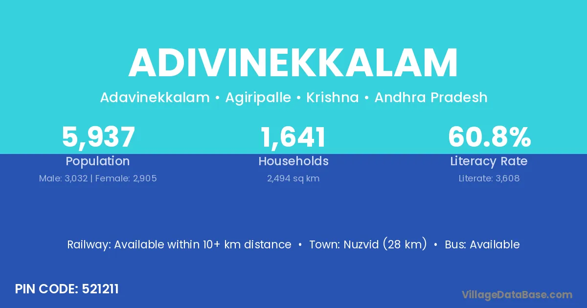 Nuzvid (28 km) is the nearest town to Adivinekkalam village for major economic activities and is located approximately 28 km away.