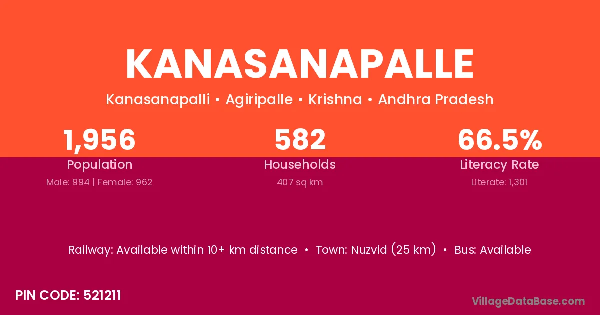 Nuzvid (25 km) is the nearest town to Kanasanapalle village for major economic activities and is located approximately 25 km away.
