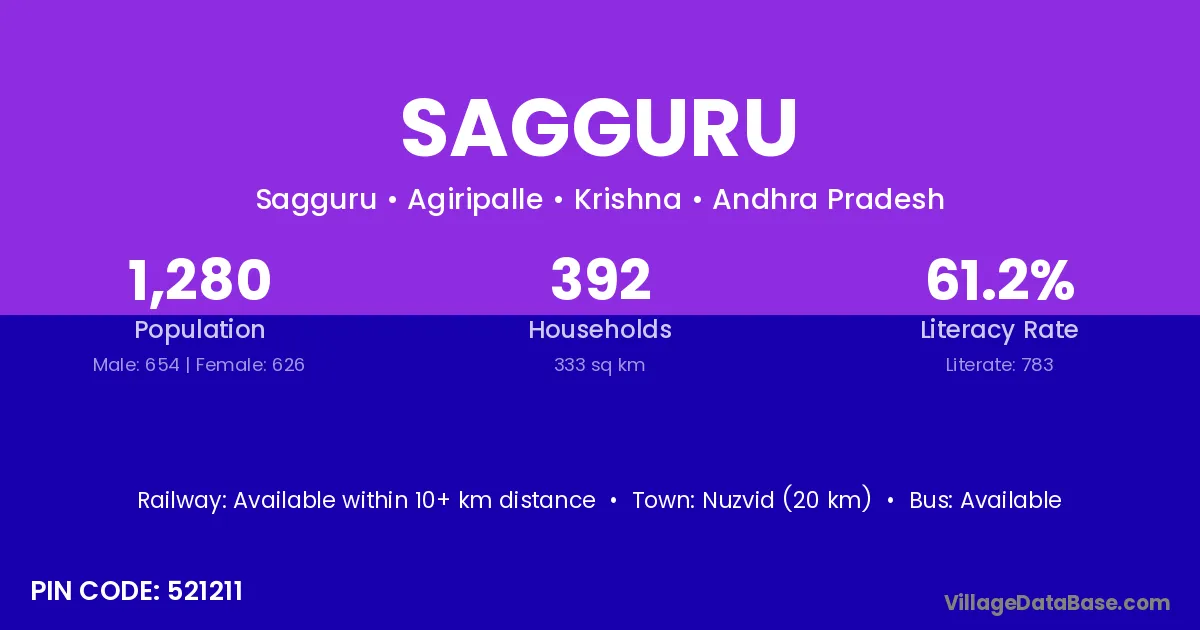 Nuzvid (20 km) is the nearest town to Sagguru village for major economic activities and is located approximately 20 km away.