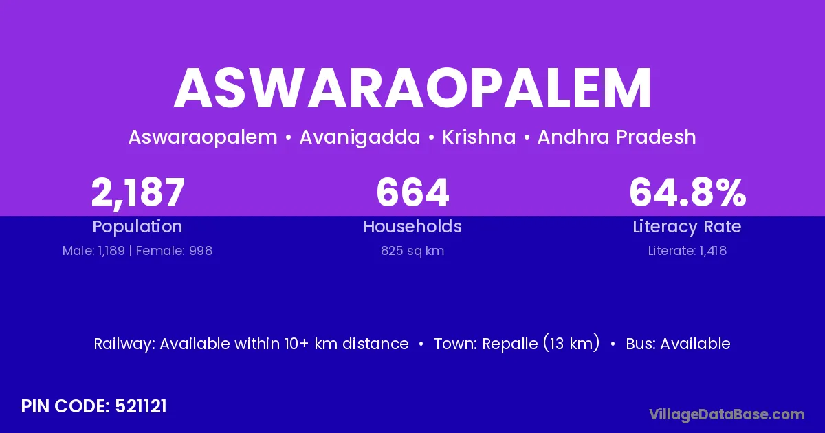 Repalle (13 km) is the nearest town to Aswaraopalem village for major economic activities and is located approximately 13 km away.