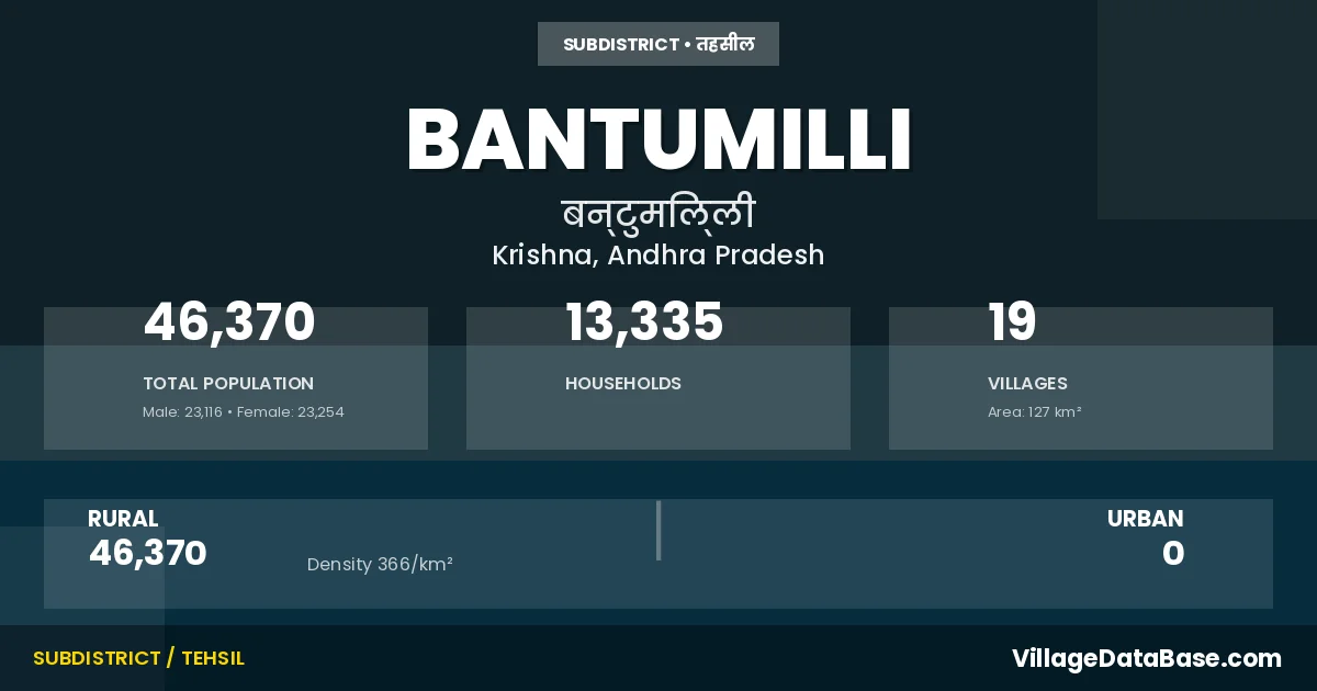According to the 2011 census The total area of Bantumilli Mandal is 127 km², with a population of 46370 people. The population density is 366 inhabitants per square kilometre, and there are approximately 13335 houses in the sub district.