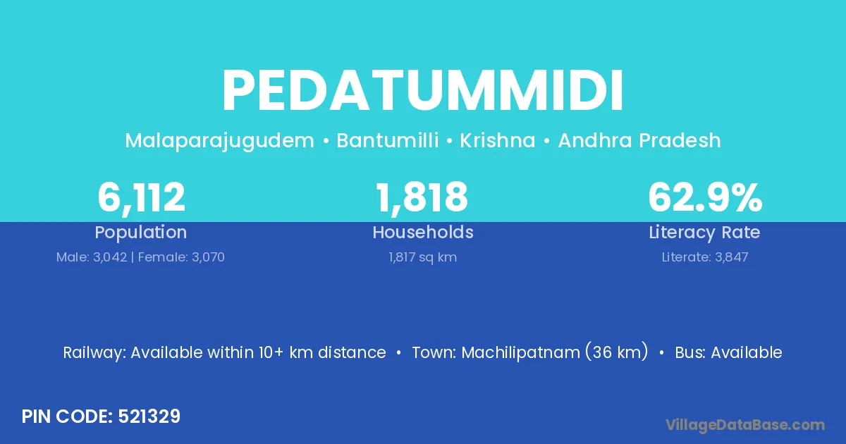 Machilipatnam (36 km) is the nearest town to Pedatummidi village for major economic activities and is located approximately 36 km away.