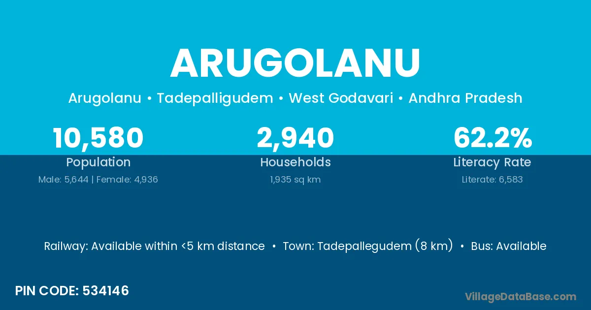 Gudivada (14 km) is the nearest town to Arugolanu village for major economic activities and is located approximately 14 km away.
