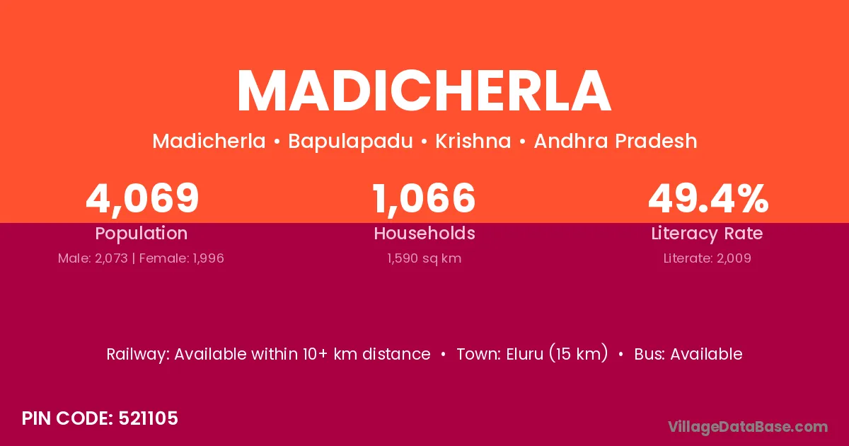 Eluru (15 km) is the nearest town to Madicherla village for major economic activities and is located approximately 15 km away.
