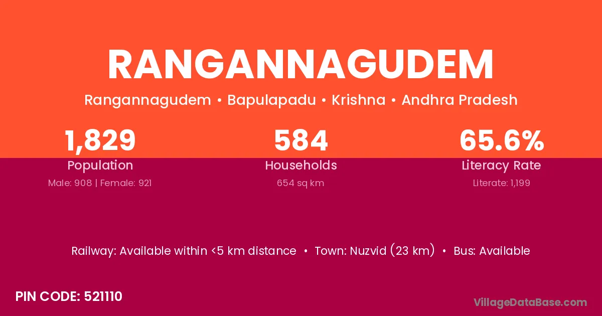 Nuzvid (23 km) is the nearest town to Rangannagudem village for major economic activities and is located approximately 23 km away.