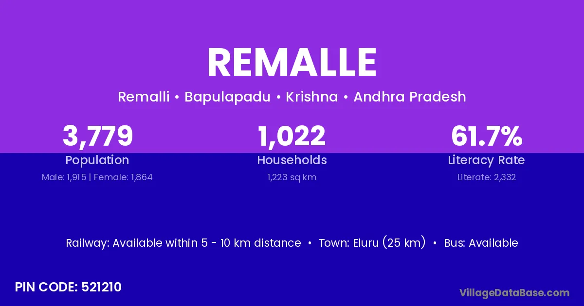 Eluru (25 km) is the nearest town to Remalle village for major economic activities and is located approximately 25 km away.