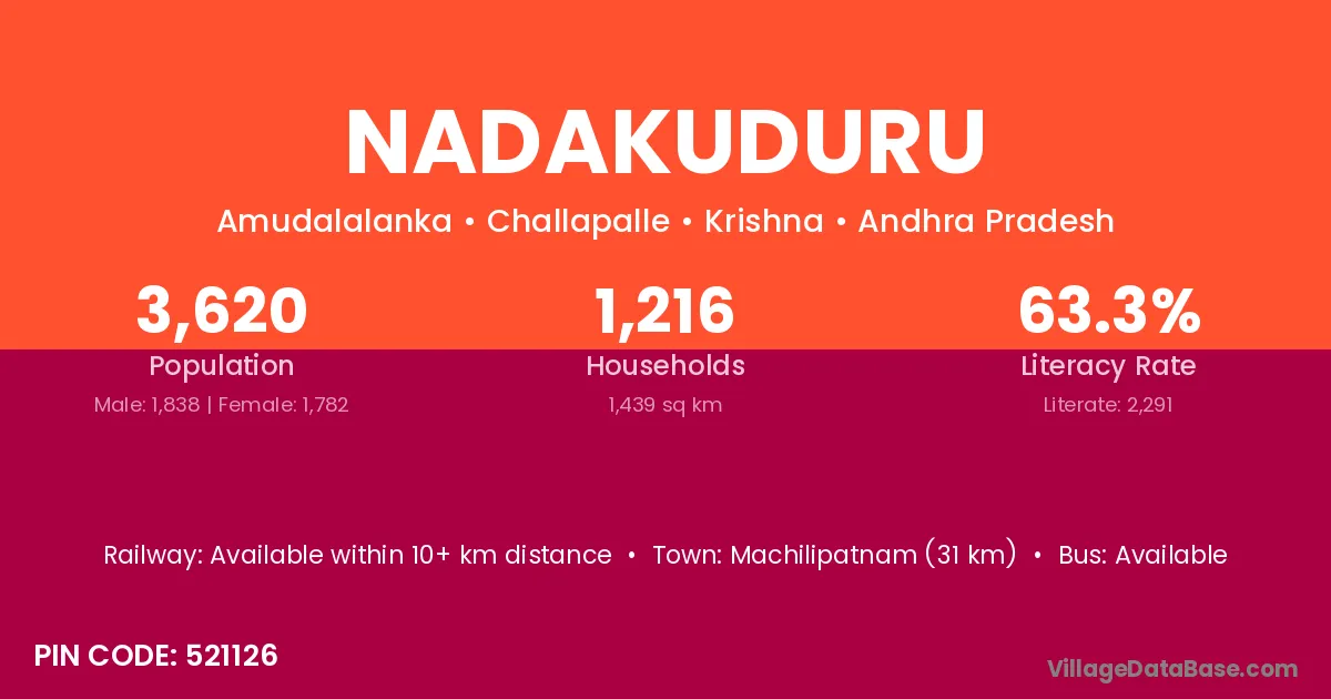 Nadakuduru village has a total population of 3,620 people, of which 1,838 are males and 1,782 are females.
