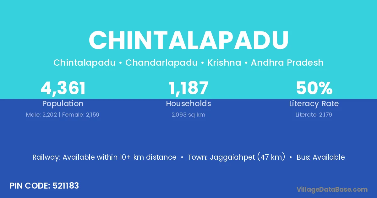 Jaggaiahpet (47 km) is the nearest town to Chintalapadu village for major economic activities and is located approximately 47 km away.