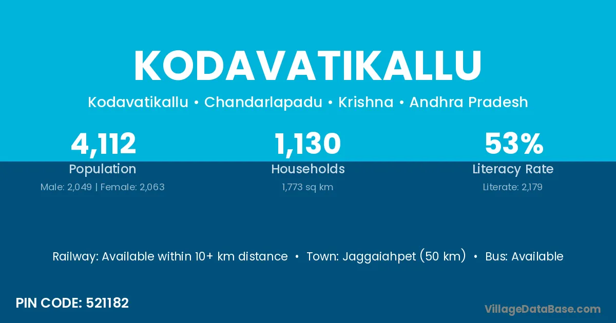 Jaggaiahpet (50 km) is the nearest town to Kodavatikallu village for major economic activities and is located approximately 50 km away.