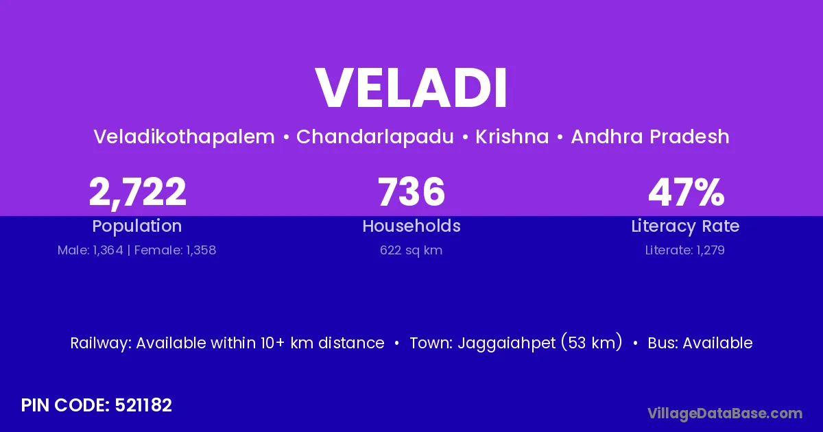 Jaggaiahpet (53 km) is the nearest town to Veladi village for major economic activities and is located approximately 53 km away.