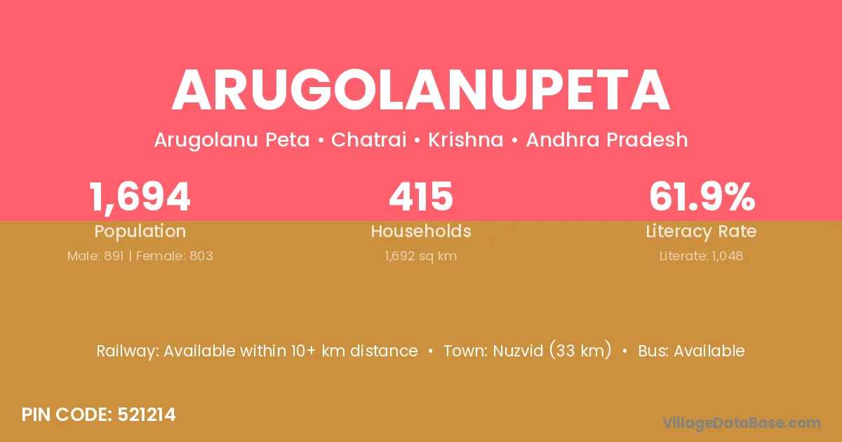 Nuzvid (33 km) is the nearest town to Arugolanupeta village for major economic activities and is located approximately 33 km away.