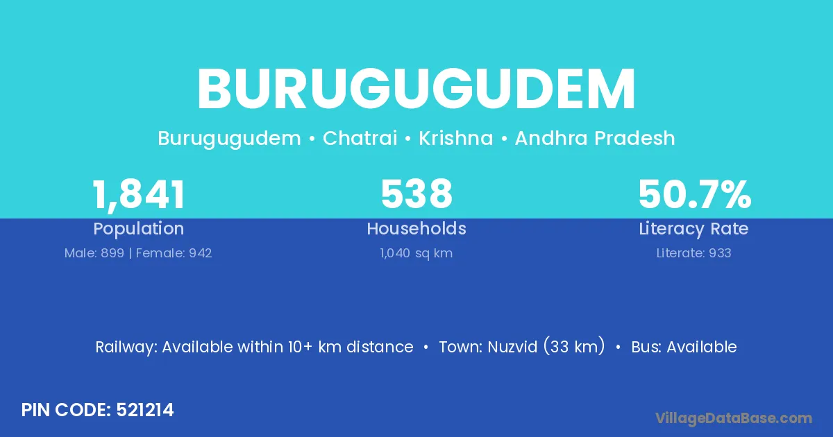 Nuzvid (33 km) is the nearest town to Burugugudem village for major economic activities and is located approximately 33 km away.