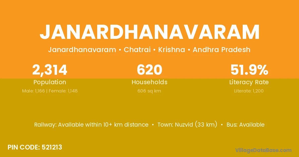 Nuzvid (33 km) is the nearest town to Janardhanavaram village for major economic activities and is located approximately 33 km away.