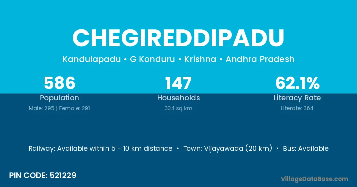 Chegireddipadu village has a total population of 586 people, of which 295 are males and 291 are females.