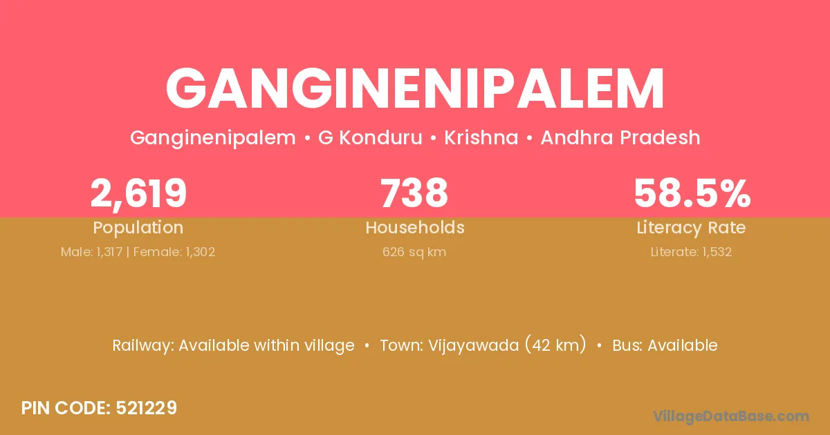Vijayawada (42 km) is the nearest town to Ganginenipalem village for major economic activities and is located approximately 42 km away.