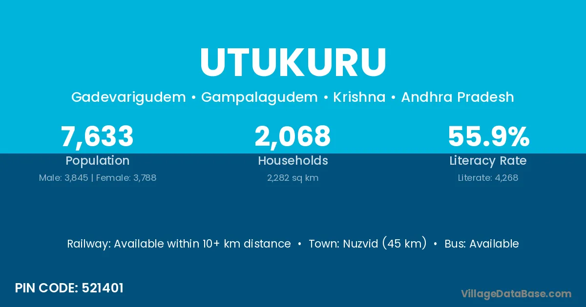 Nuzvid (45 km) is the nearest town to Utukuru village for major economic activities and is located approximately 45 km away.