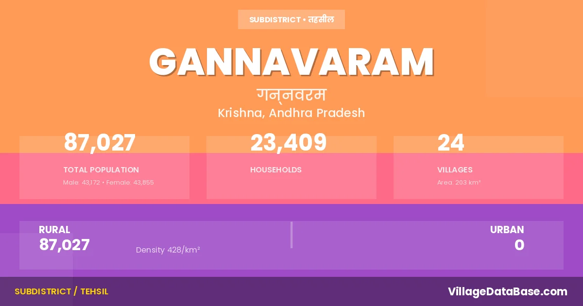 According to the 2011 census The total area of Gannavaram Mandal is 203 km², with a population of 87027 people. The population density is 428 inhabitants per square kilometre, and there are approximately 23409 houses in the sub district.