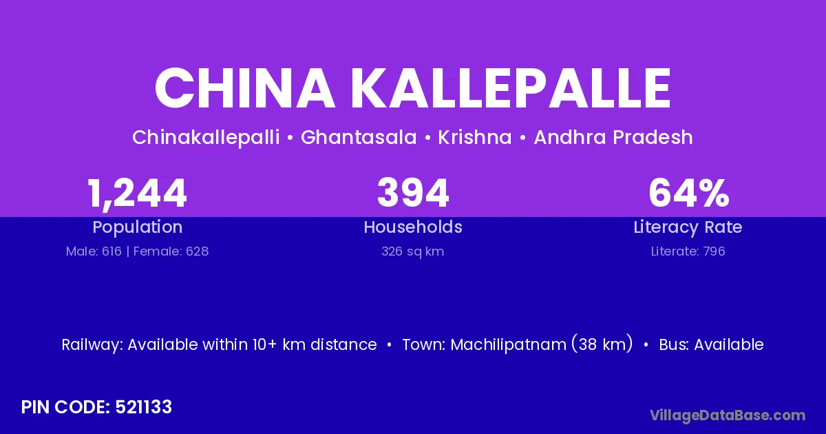Machilipatnam (38 km) is the nearest town to China Kallepalle village for major economic activities and is located approximately 38 km away.