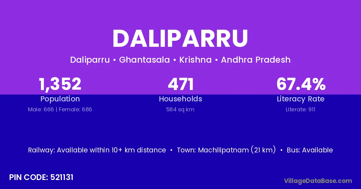 Machilipatnam (21 km) is the nearest town to Daliparru village for major economic activities and is located approximately 21 km away.