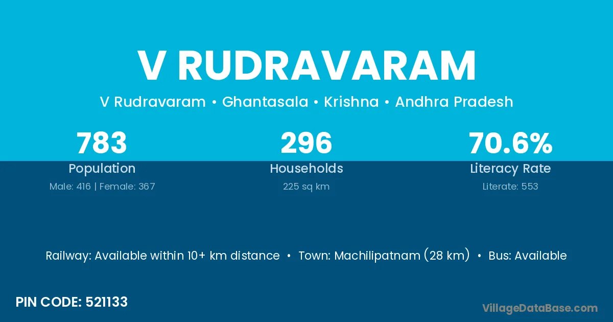 Machilipatnam (28 km) is the nearest town to V Rudravaram village for major economic activities and is located approximately 28 km away.