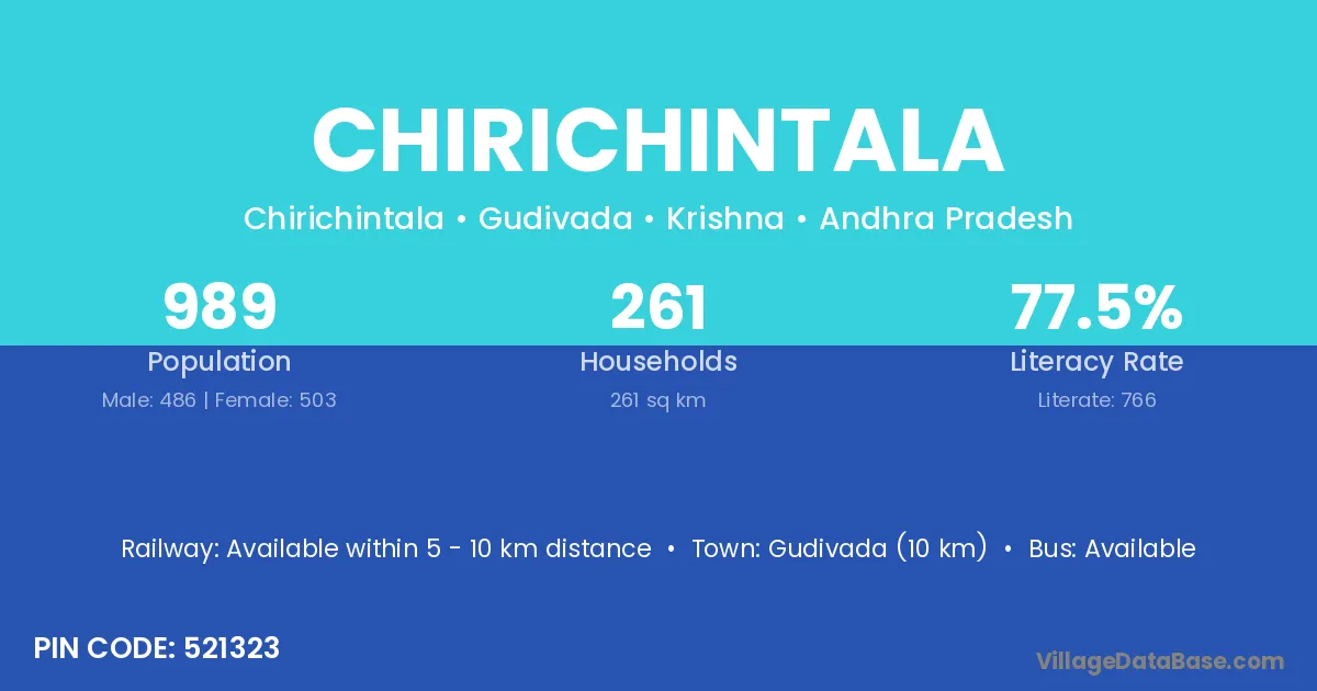 Gudivada (10 km) is the nearest town to Chirichintala village for major economic activities and is located approximately 10 km away.