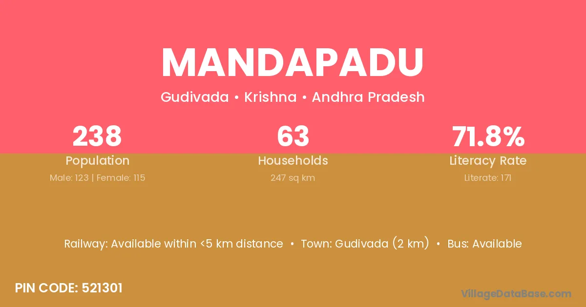 Gudivada (2 km) is the nearest town to Mandapadu village for major economic activities and is located approximately 2 km away.