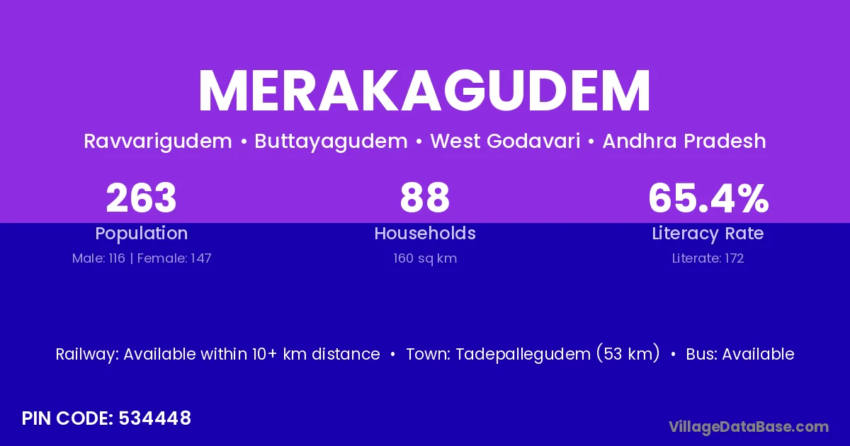 Gudivada (4 km) is the nearest town to Merakagudem village for major economic activities and is located approximately 4 km away.