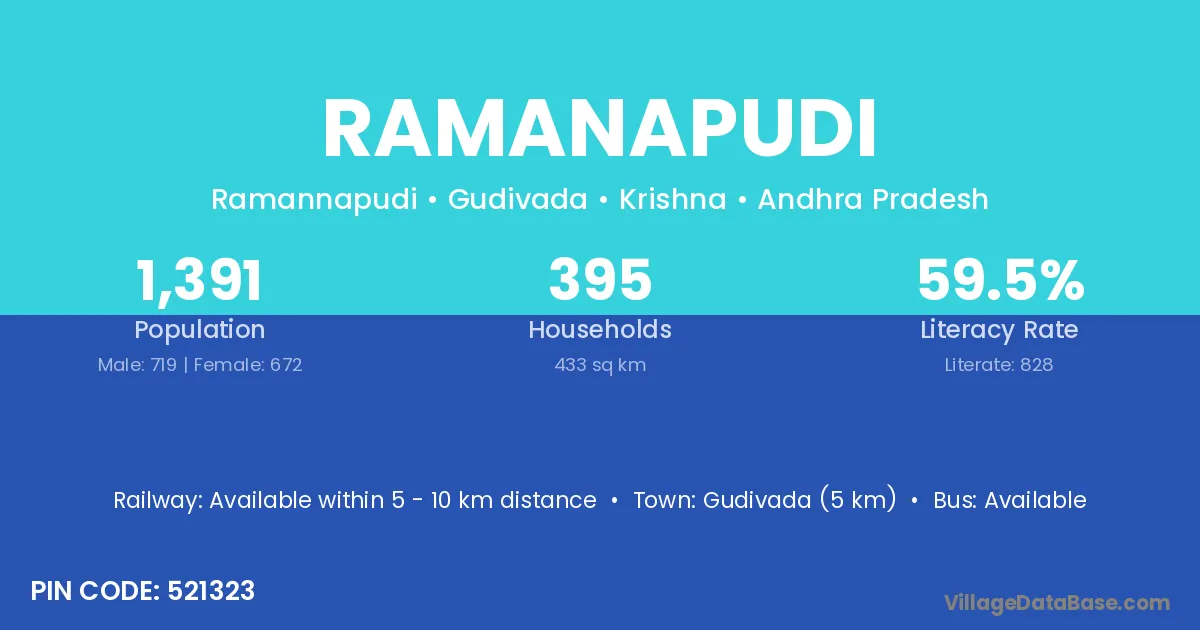 Gudivada (5 km) is the nearest town to Ramanapudi village for major economic activities and is located approximately 5 km away.
