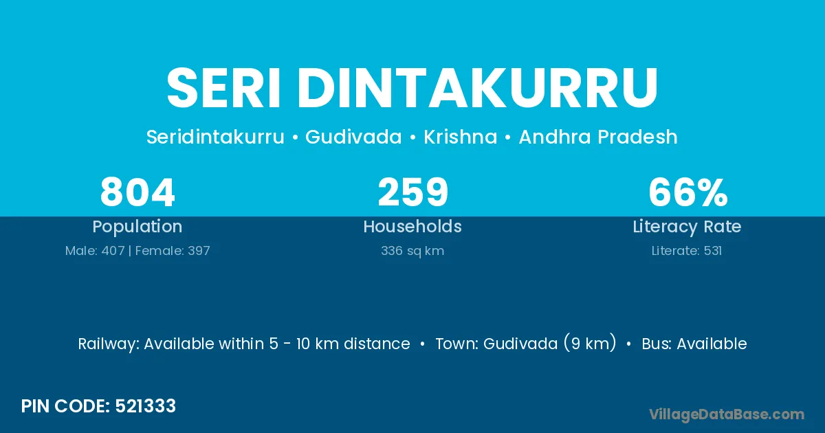 Gudivada (9 km) is the nearest town to Seri Dintakurru village for major economic activities and is located approximately 9 km away.