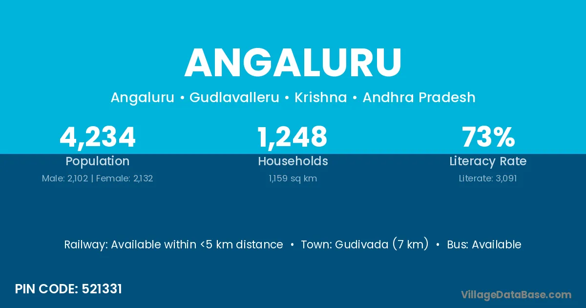 Gudivada (7 km) is the nearest town to Angaluru village for major economic activities and is located approximately 7 km away.