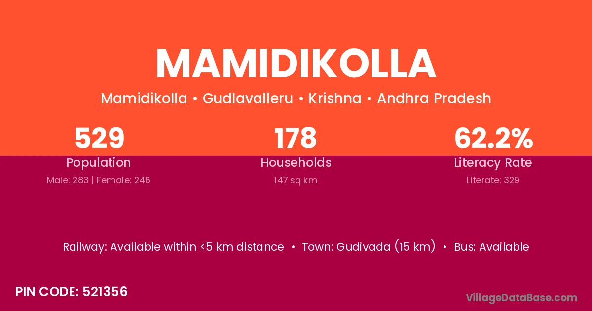Gudivada (15 km) is the nearest town to Mamidikolla village for major economic activities and is located approximately 15 km away.