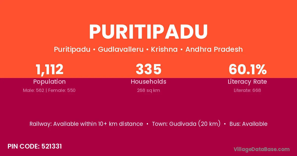 Gudivada (20 km) is the nearest town to Puritipadu village for major economic activities and is located approximately 20 km away.