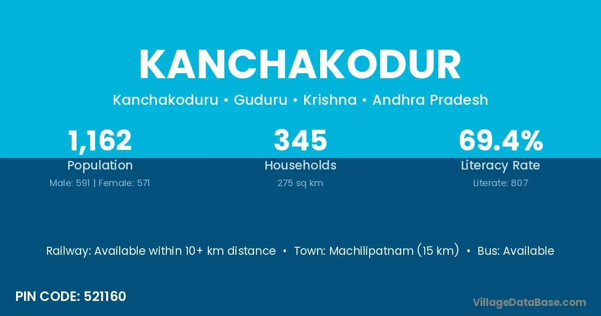 Machilipatnam (15 km) is the nearest town to Kanchakodur village for major economic activities and is located approximately 15 km away.