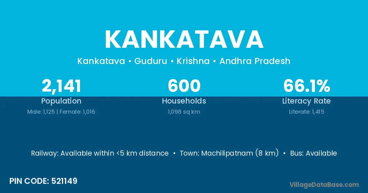 Machilipatnam (8 km) is the nearest town to Kankatava village for major economic activities and is located approximately 8 km away.