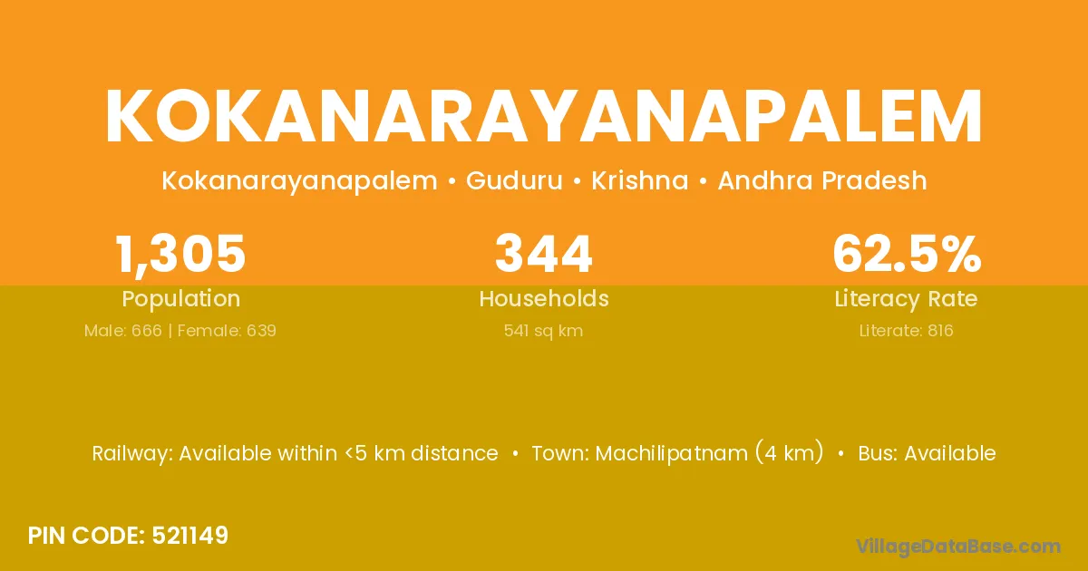Machilipatnam (4 km) is the nearest town to Kokanarayanapalem village for major economic activities and is located approximately 4 km away.