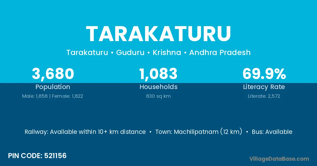 Tarakaturu village has a total population of 3,680 people, of which 1,858 are males and 1,822 are females.