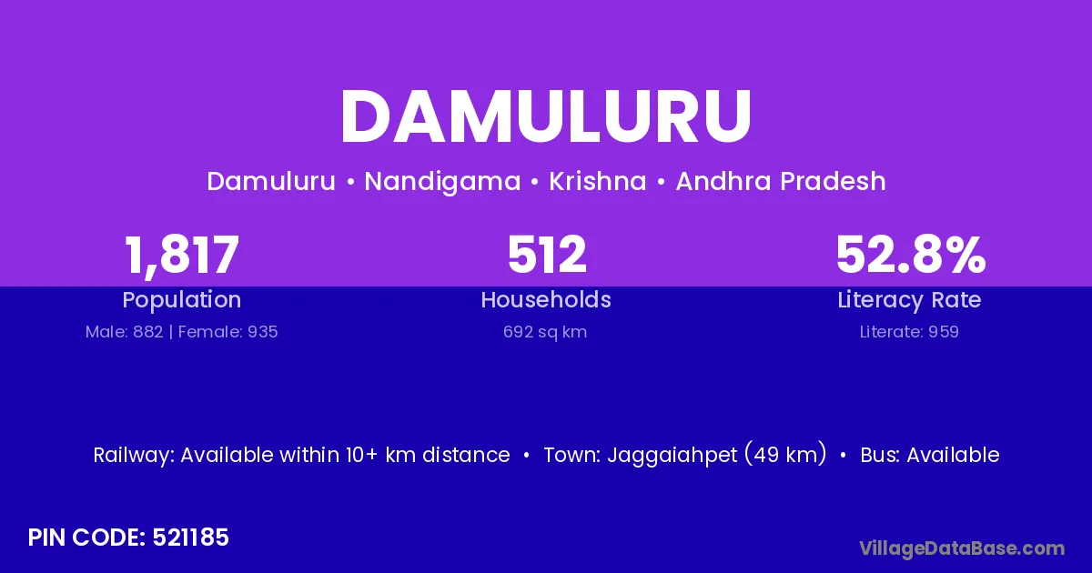 Vijayawada (35 km) is the nearest town to Damuluru village for major economic activities and is located approximately 35 km away.