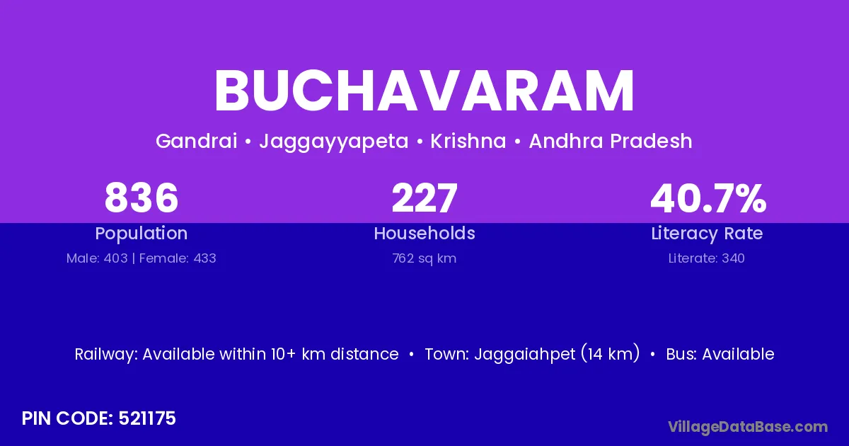 Jaggaiahpet (14 km) is the nearest town to Buchavaram village for major economic activities and is located approximately 14 km away.