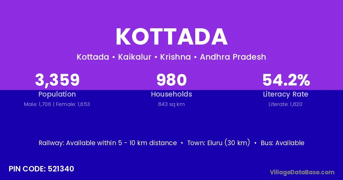 Kottada village has a total population of 3,359 people, of which 1,706 are males and 1,653 are females.