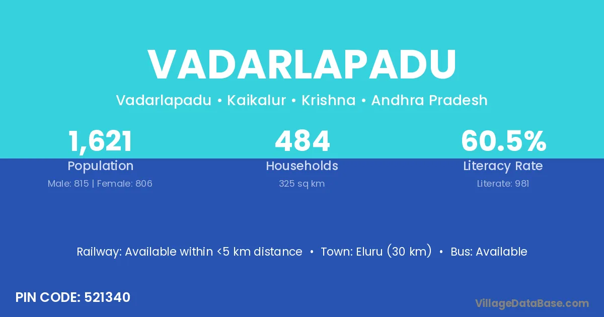 Eluru (30 km) is the nearest town to Vadarlapadu village for major economic activities and is located approximately 30 km away.