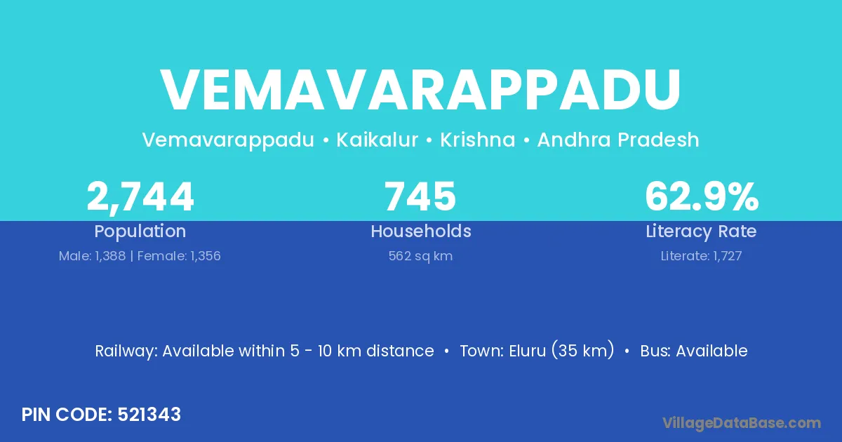 Eluru (35 km) is the nearest town to Vemavarappadu village for major economic activities and is located approximately 35 km away.