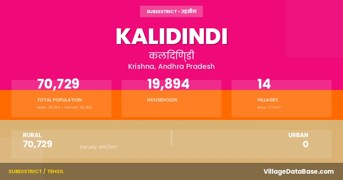 According to the 2011 census The total area of Kalidindi Mandal is 177 km², with a population of 70729 people. The population density is 400 inhabitants per square kilometre, and there are approximately 19894 houses in the sub district.