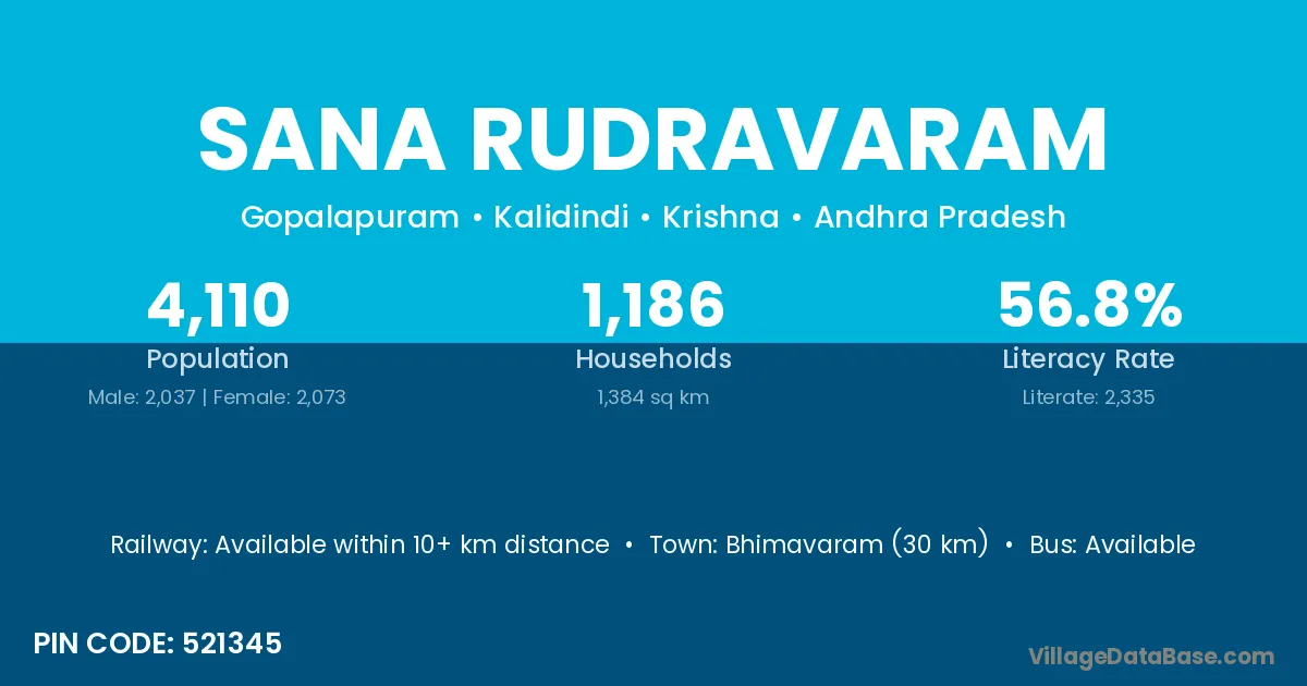 Bhimavaram (30 km) is the nearest town to Sana Rudravaram village for major economic activities and is located approximately 30 km away.