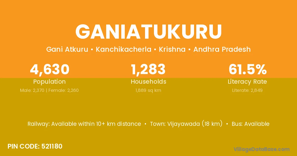 Vijayawada (18 km) is the nearest town to Ganiatukuru village for major economic activities and is located approximately 18 km away.