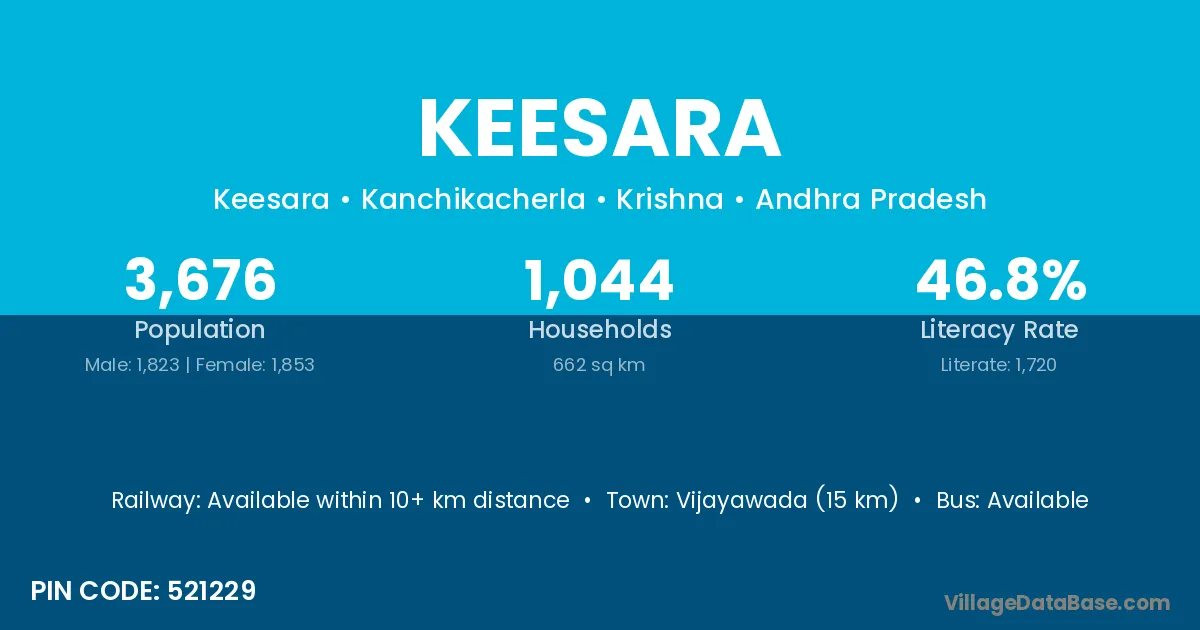 Vijayawada (15 km) is the nearest town to Keesara village for major economic activities and is located approximately 15 km away.