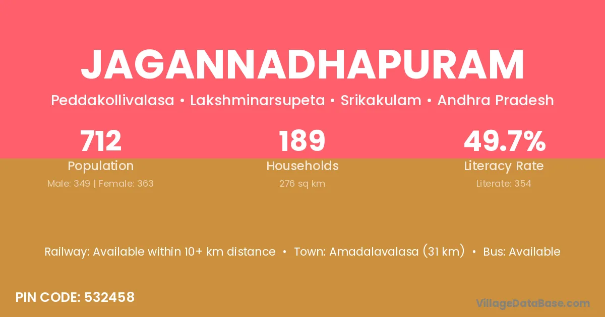 The literacy rate of Jagannadhapuram village is 61.39%. Male literacy stands at 65.99% and female literacy at 57.05%.