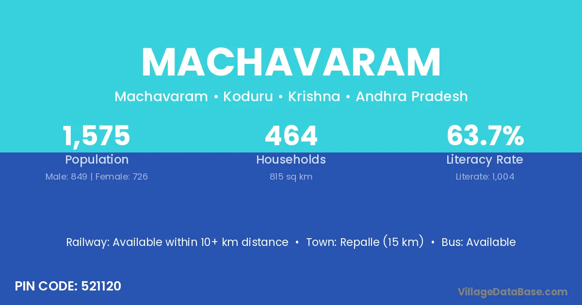 Repalle (15 km) is the nearest town to Machavaram village for major economic activities and is located approximately 15 km away.
