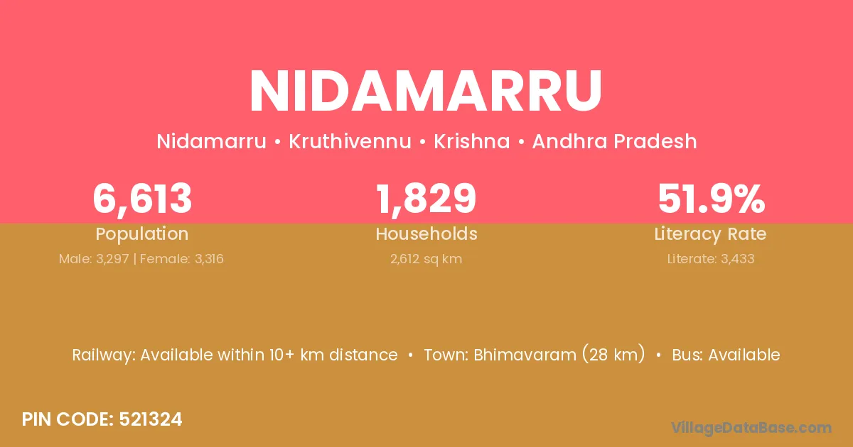 Nidamarru village has a total population of 6,613 people, of which 3,297 are males and 3,316 are females.