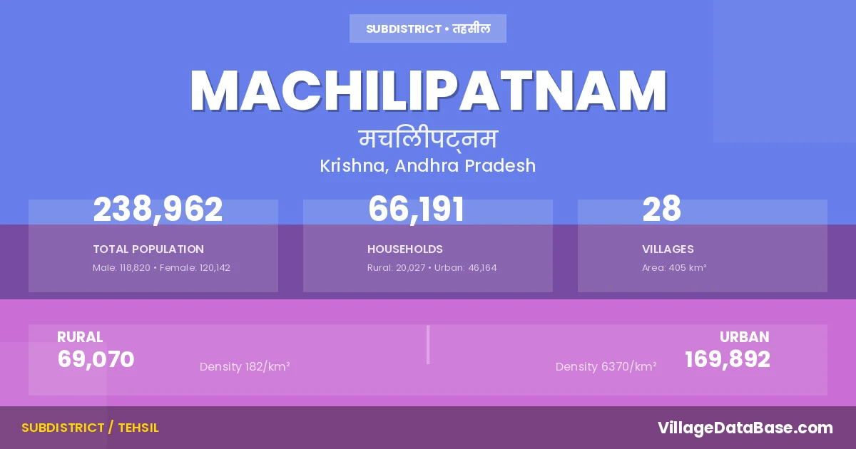 According to the 2011 census The total area of Machilipatnam Mandal is 405 km², with a population of 238962 people. The population density is 590 inhabitants per square kilometre, and there are approximately 66191 houses in the sub district.